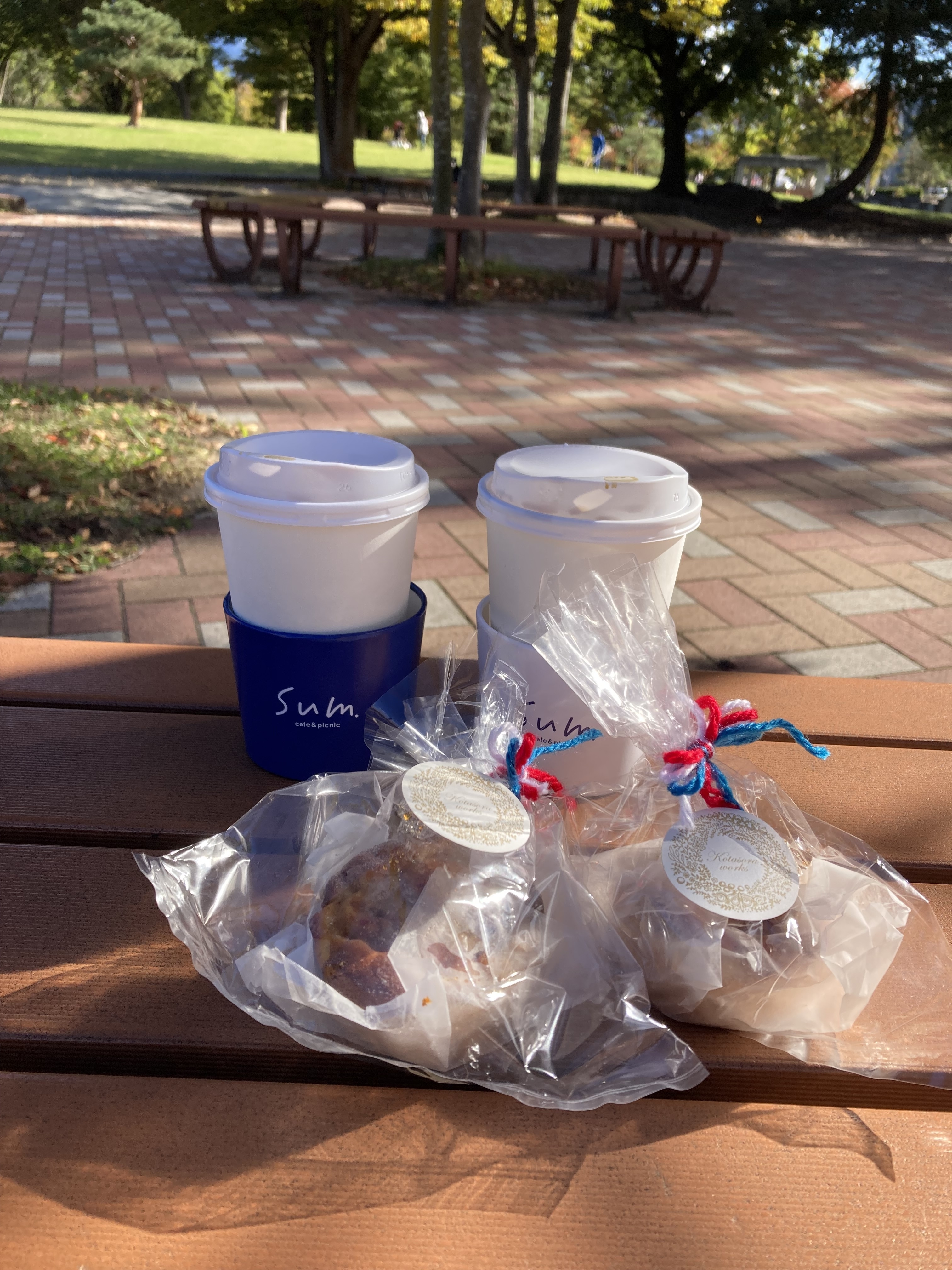 先週の暖かかった日に、公園で色づいた景色を見ながらベンチで珈琲と焼き菓子をいただきました♩