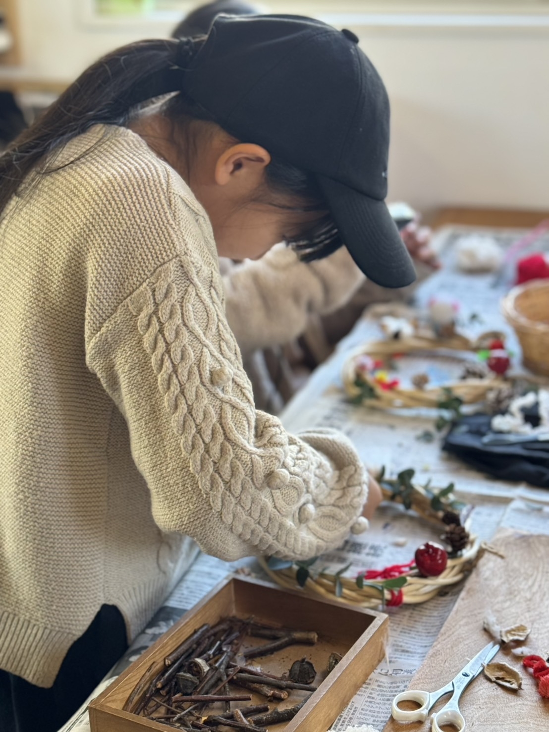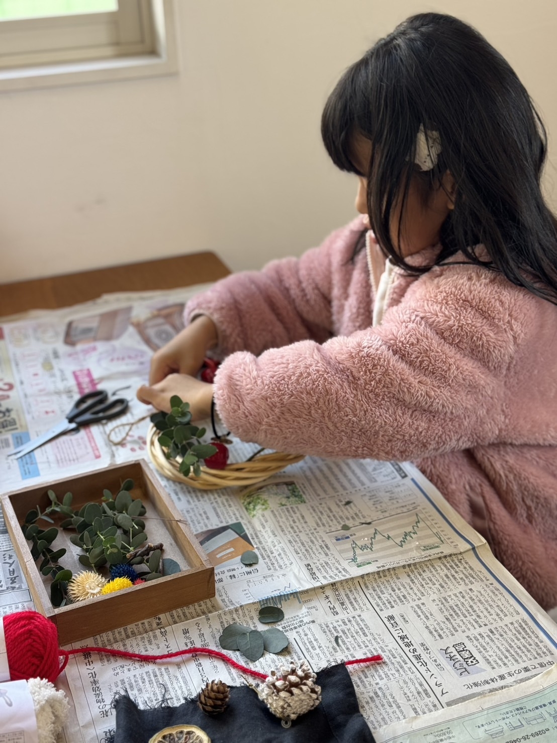 こちらで用意した木の実やドライのお花、毛糸などの材料を自由に使ってもらい作るリース。
