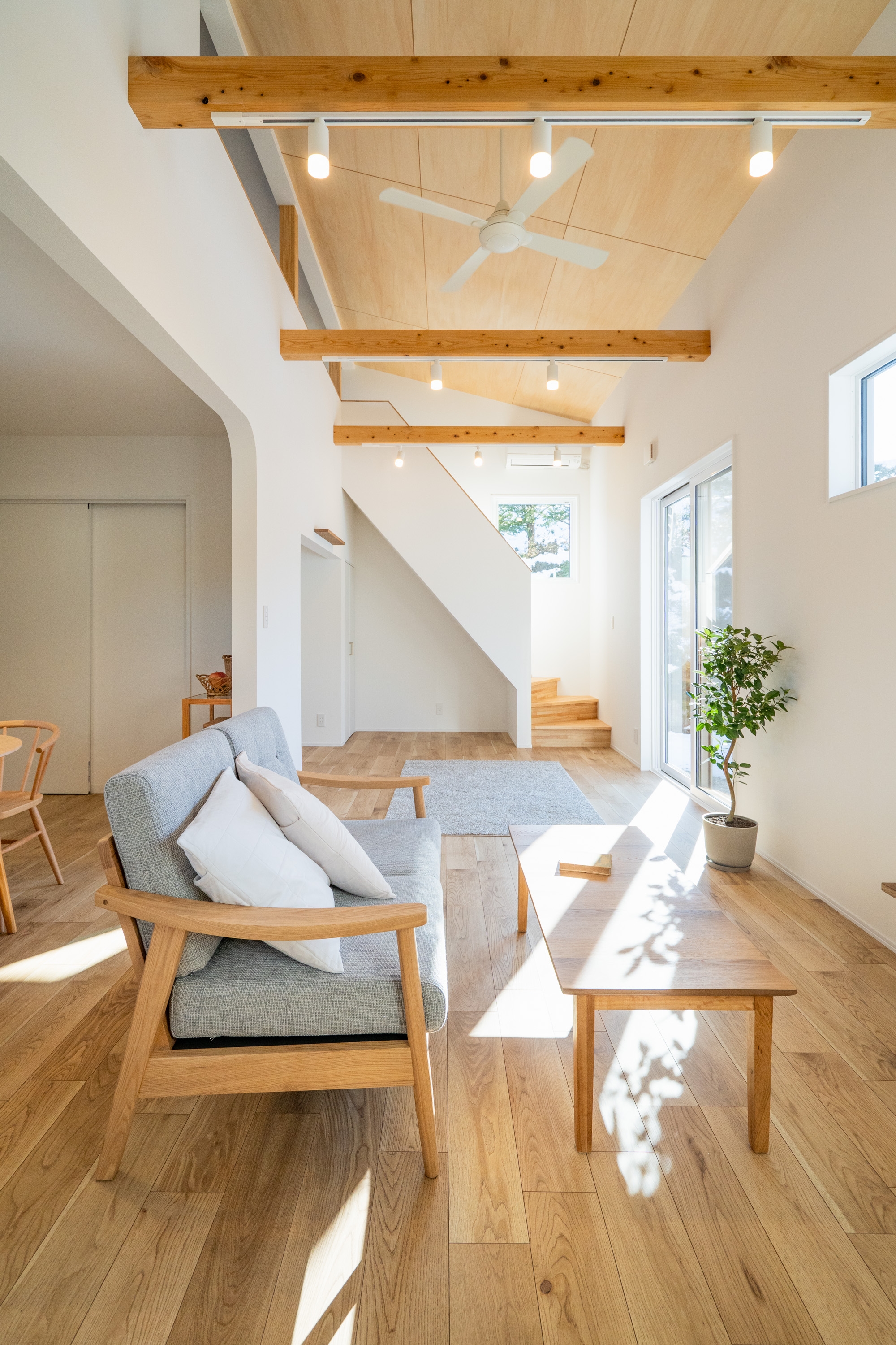 吹抜けのあるリビングは、空間にのびやかな広がりを生み出します。