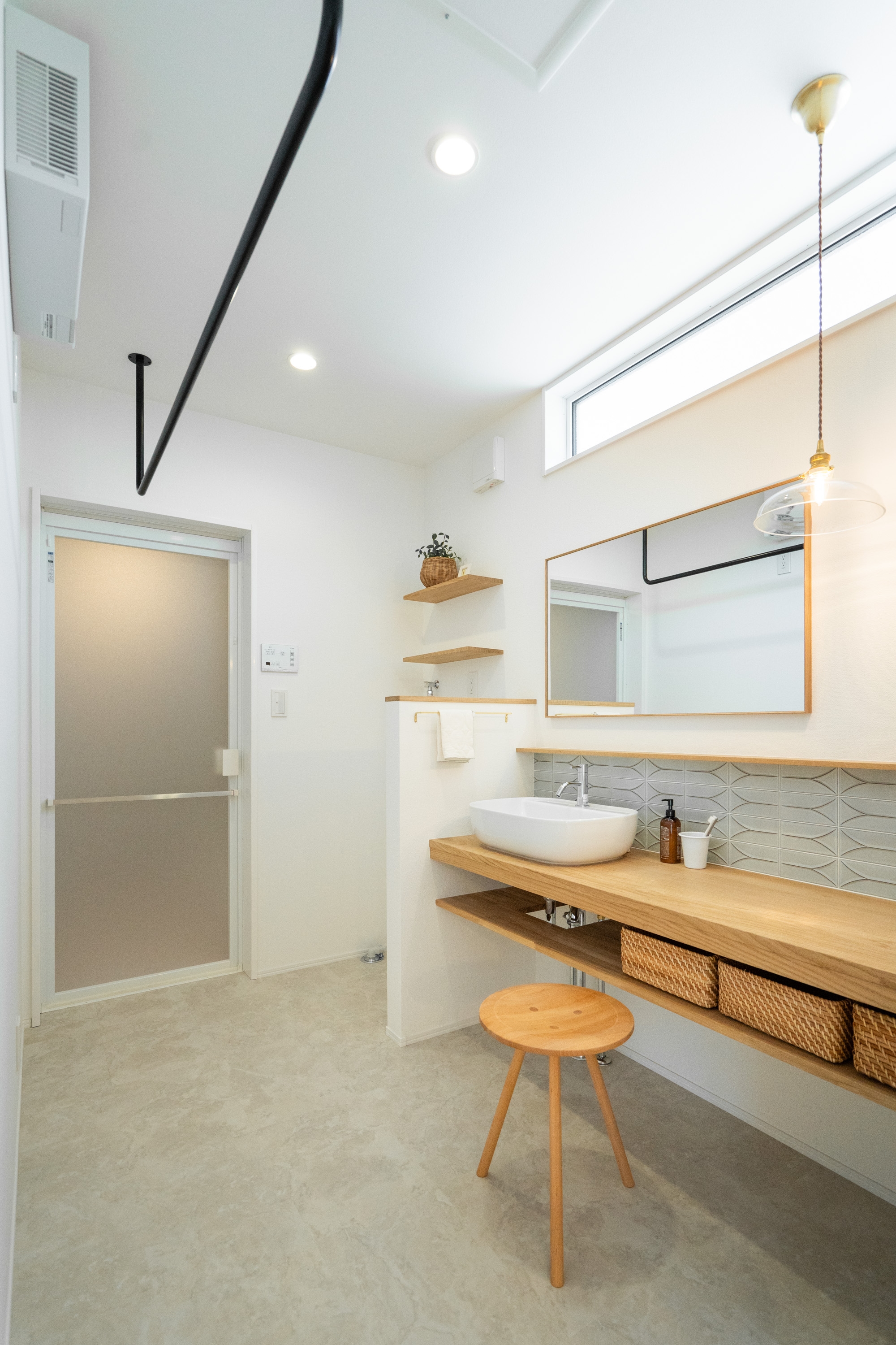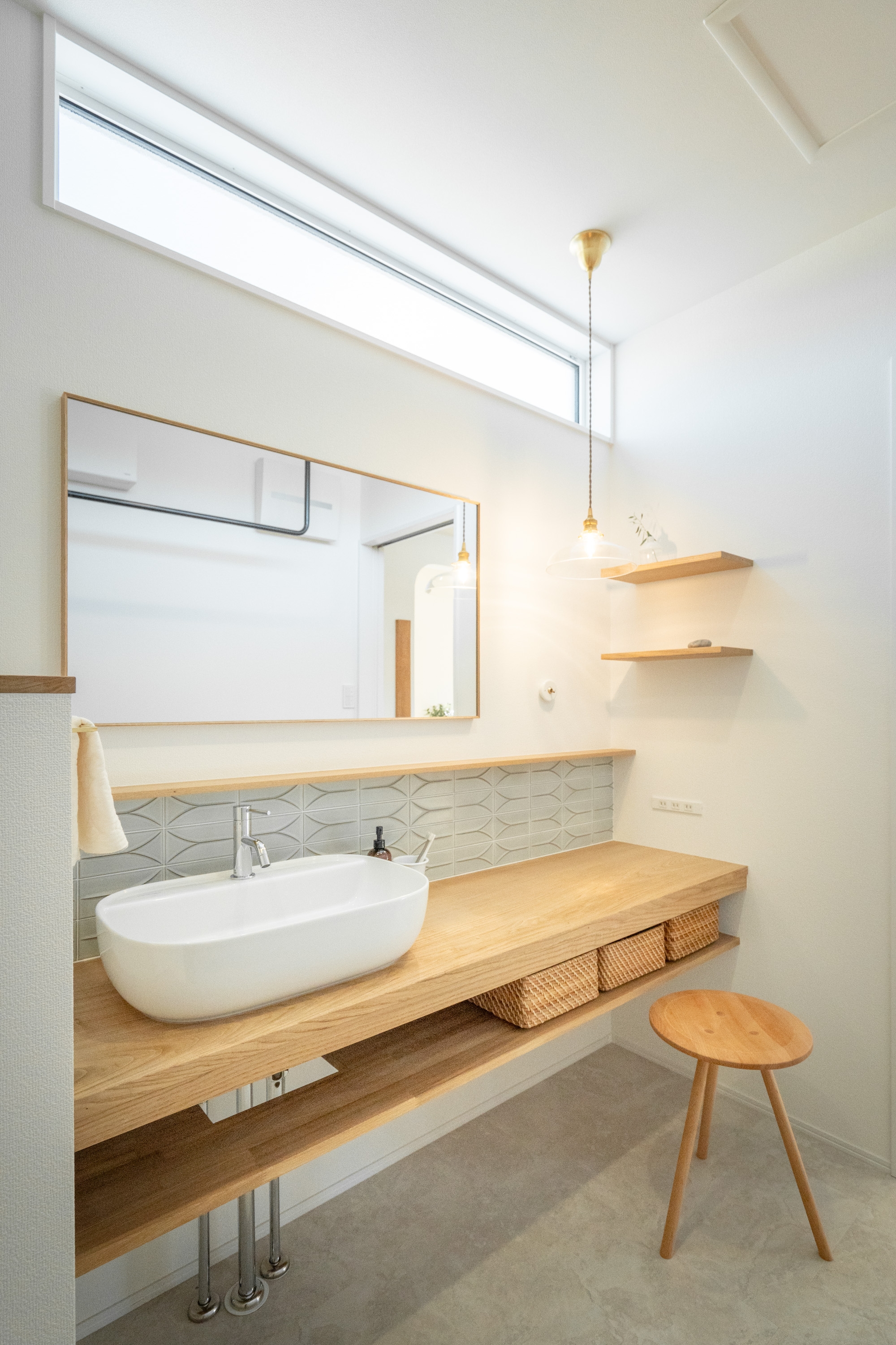 洗面脱衣室には、無垢の木で作った造作洗面台。