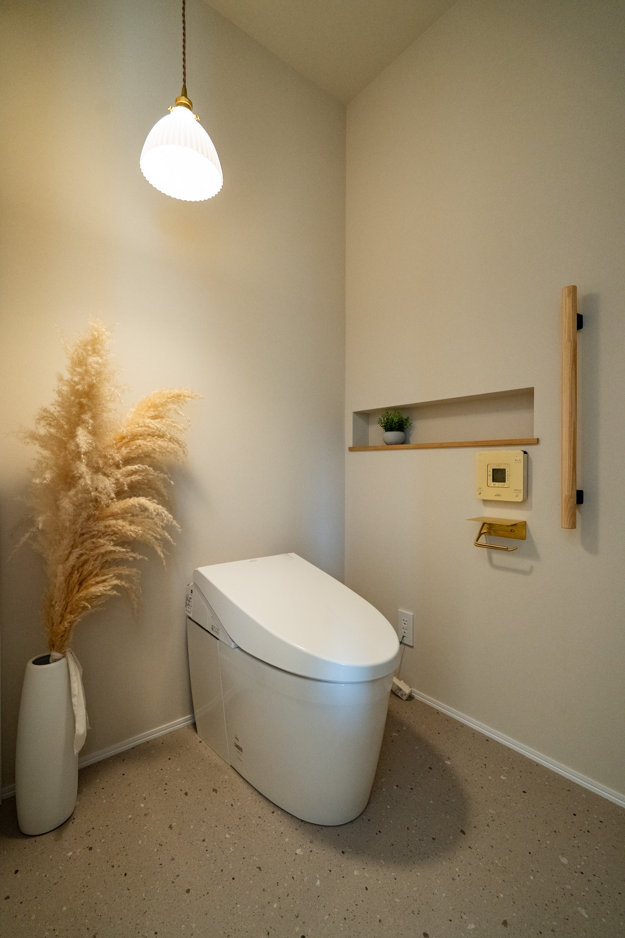 レストルームは床・壁ともベージュを基調に、真鍮の小物でやさしい雰囲気にまとめました。